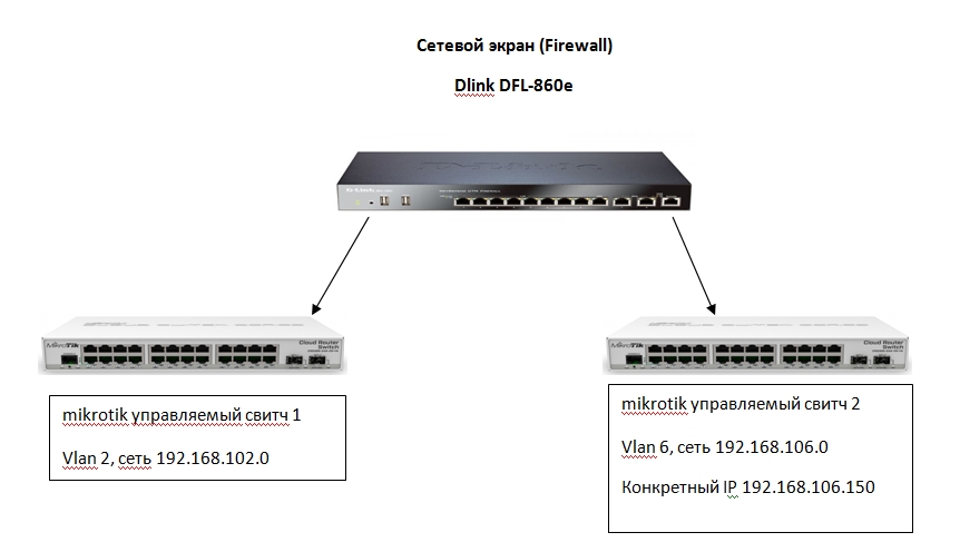 Есть два свитча (управляемые), которые соединены с межсетевым экраном (Dlink DFL-860e).