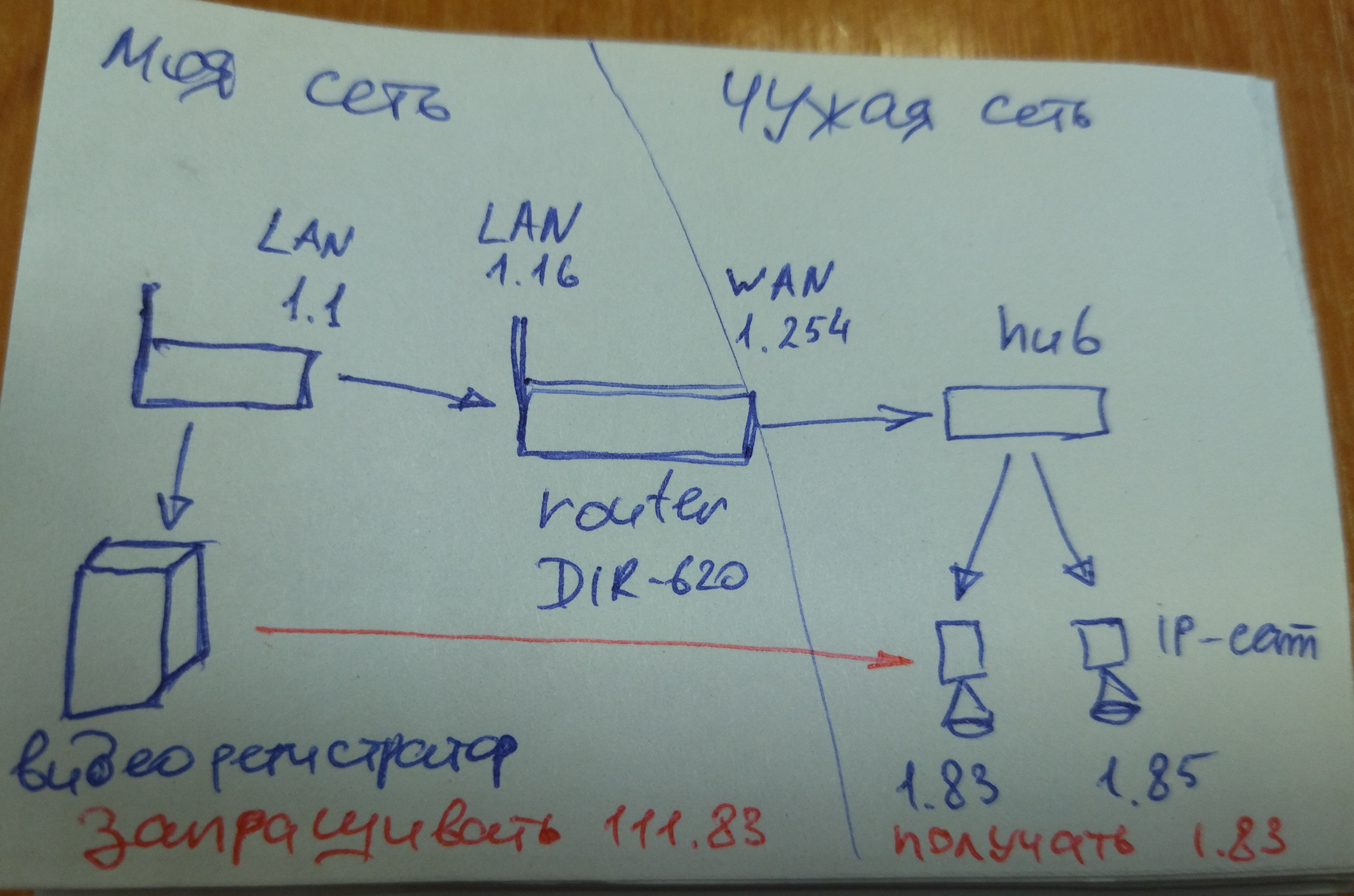 дано 2 сети с одинаковыми подсетями и масками = 192.168.1.0/24 (адреса устройств в этих сетях могут пересекаться) в моей сети видеорегистратор, в чужой ip-камеры задача: получать видео с чужих камер, но чтобы к моим устройствам из чужой сети доступа не было