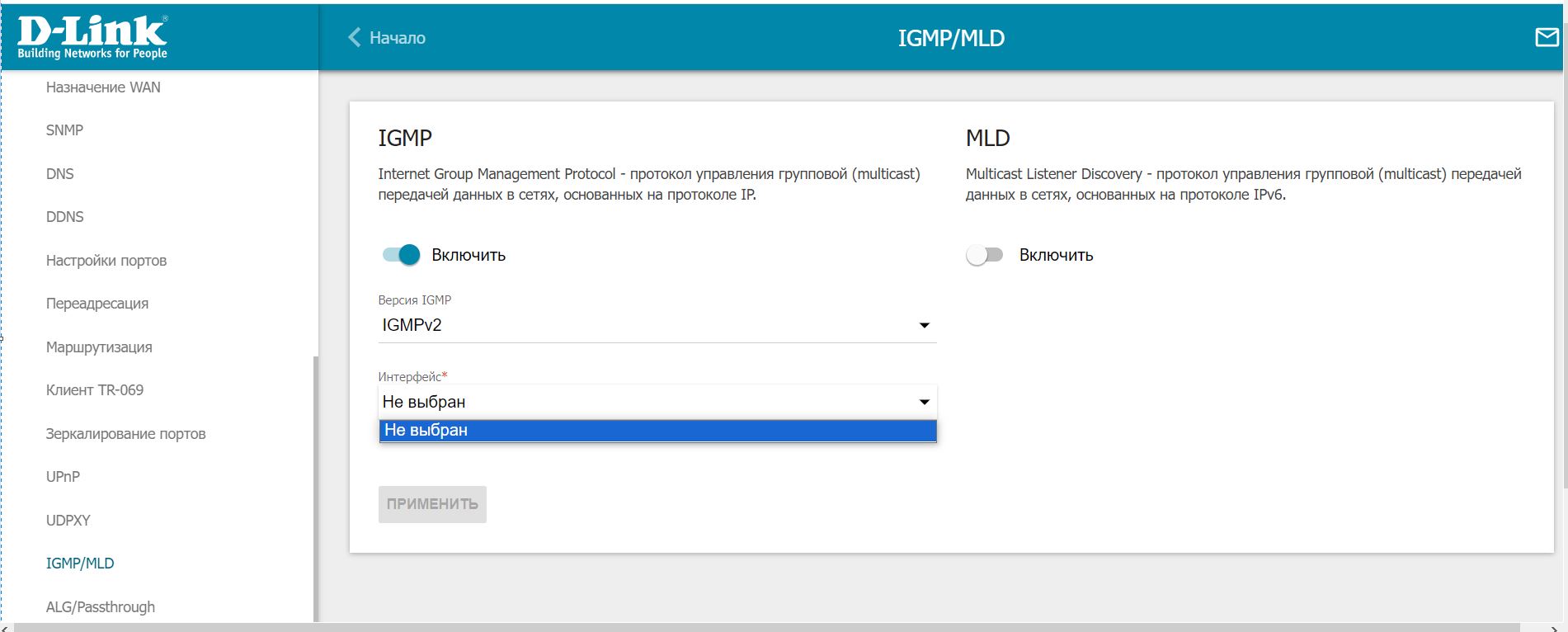 Подскажите, как включить IGMP? В разделе WAN идет ссылка на раздел IGMP. В разделе IGMP нет возможности выбрать интерфейс на котором включить IGMP. Если интерфейс не выбирать (а это обязательное поле), то включить то можно IGMP, но IPTV не работает по причине непропуска multicast. Подскажите что я делаю не так и как это побороть?