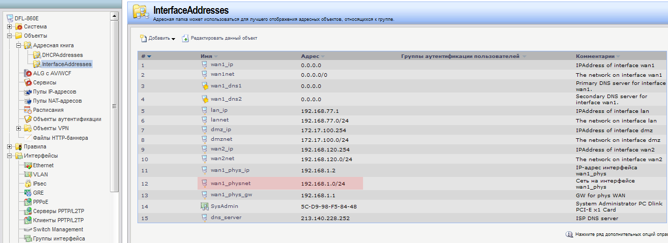 Дальше, иду в адресную книгу. Что я вижу и что я делаю в первую очередь: меняю адреса для wan1_phys_IP и wan1_physnet, а так же LAN адреса самого DFL что бы он был в той же сети, что и его клиенты.