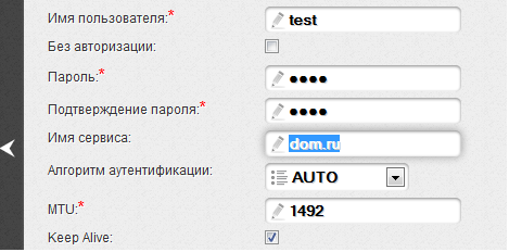 Что касается DOM.ru, у них при настройке необходимо указывать еще имя сервиса, соответственно dom.ru