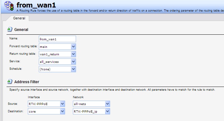Ну, начнем с Routing Rules. №2 убираем, вместо него у нас №6. В №1 заменяем dst if на any. Таким образом у нас останутся №№5 и 6 для входящих и №№1, 3, 4 для исходящих, для которых приоритетней wan2. Соответственно таблица, обозванная alt (я бы ее обозвал wan2_priority) , будет только для исходящих, не путать ее с wan2_return! Правила для исходящих можно объединить в одно, сделав группу адресов wan2_users_nets. Для симметрии можно сделать еще одну таблицу wan1_priority и соответствующее правило. Но это уже эстетика :). В этой таблице (или таблицах) *_priority у нас будут только маршруты в Интернет (all-nets) через оба wan, с мониторингом и разными метриками.