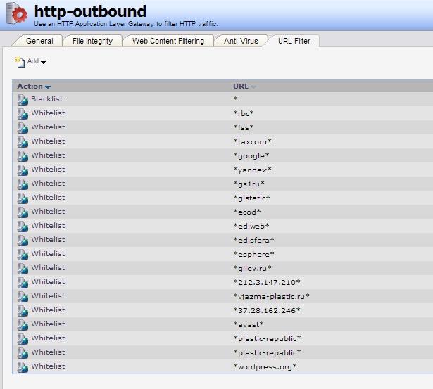 Замечания по поводу https... Это для тестов сделали.. У нас http рулится след. образом: пользователям разрешено всё, кроме blacklist сайтов, на серверах blacklist - * и добавлены whitelist, в котором несколько разрешённых сайтов... Есть группа пользователей VIP_users, которым всё-всё разрешено... Затык вот в чём: тот же google у VIP-пользователей открывается мгновенно, у пользователей и серверов, к которым применяются white/black-листы открывается... Но перед этим "тупит" от 3 до 7 секунд... Причём никак не зависит от наличия правила allow_https... Некритично, но странно... Делаем правило, применяем конфигурацию - открывается мгновенно, через некоторое время (условно час), начинает задерживаться... Если все http-правила отключить - всё мгновенно открывается... Не только гугл... Штук 5 сайтов, которые по https пробовали... И замечание - одноклассники, втентакле и ютуп, вроде, не умеют https и прекрасно режутся внесением URL в blacklist...