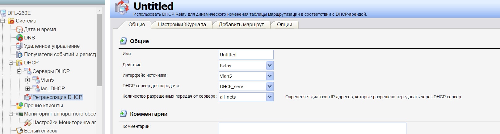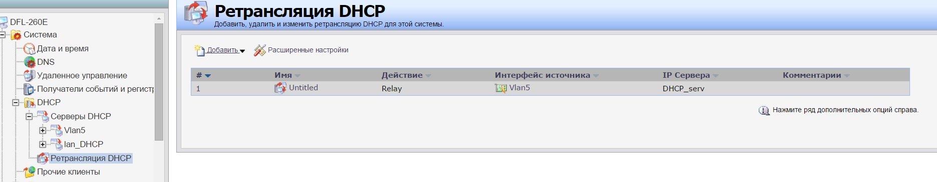 Подскажите еще пожалуйста, когда добавляю и настраиваю DHCP Relay - то какое значение поставить в "DHCP-сервер для передачи"?