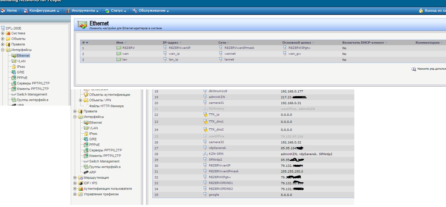 б)в интерфейсах был там по умолчанию DMZ переименовал его REZERV и в свойствах указал вкладка общие ИП адрес, сеть, шлюз(которые создал в адресной книге)