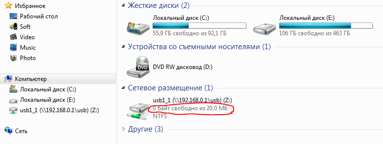 Samba... Она как бы есть, но нет возможности добавить шару. Подключил сетевой диск (\\192.168.0.1\usb\usb1_1), но пишет, что места на диске 0 байт из 20Мб. Ничего не могу закинуть на диск по сети. Transmission при включеной Samba, не закачивает файлы - ссылается на недостаточное количество места.