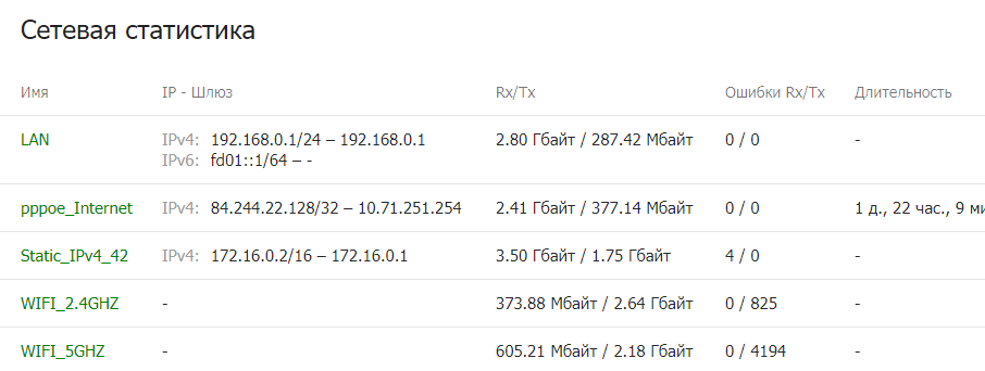 И там WAN принято ~52 Гбайта, отправленно ~22 Гбайта, что соответствует действительности. Роутер запущен, и соединение через pppoe одновременно.