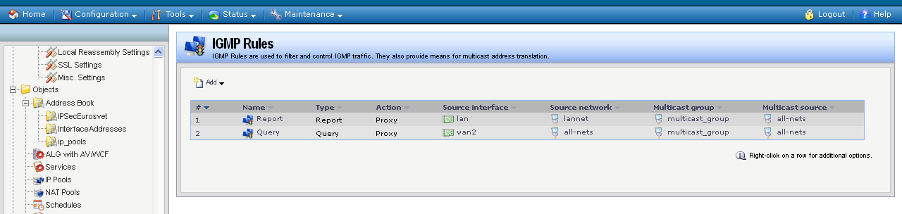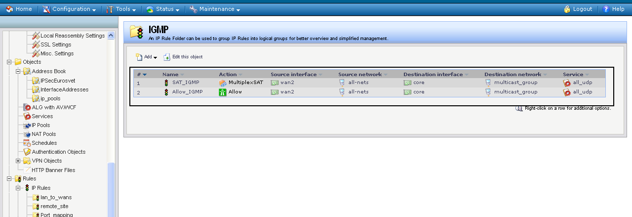 IPTV настраивал по инструкции, что нашел в инете(http://ftp.dlink.ru/pub/FireWall/DFL_Multicast.pdf). Эта же приставка, в другом офисе, но через DFL-260E(с одним провайдером) работает, все показывает. Конфигурации DFL сравнивал - все настройки для IGMP одинаковы. Провайдеры IPTV одинаковы.