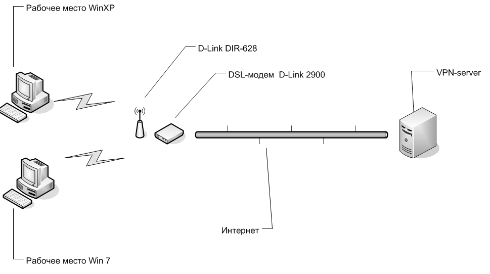 Модем настроен как бридж или как роутер? Без DIR-628 рабочая машина, подключенная к DSL модему может поднять соединение до VPN-сервера?