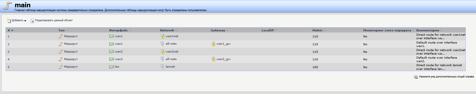 Добавляете в нее маршрут wan1 all-nets wan1_gw 100 (без мониторинга)