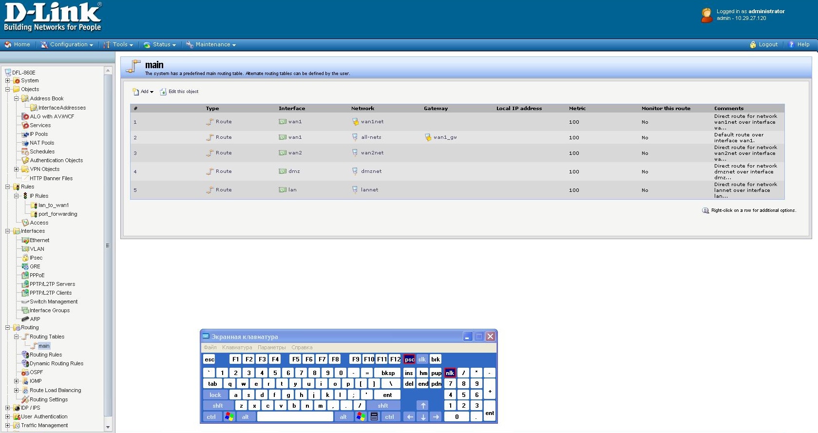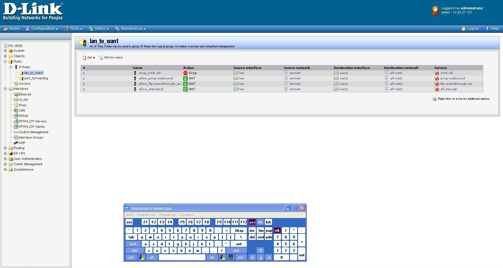 Здраствуйте. Подскажите по поводу DFL-860E. У нас к нему подключен интернет через порт wan1. К первому порту lan подключен сервер интернета. Ко второму еще несколько пользователей,через свич, которые напрямую идут в интернет минуя прокси-сервер. И есть еще один сервер подключенный к третьему порту. Вчера начались странные вещи, один сервер прекрасно выходит в интернет без задержек. Второй начинает выходить в интернет и зависает на загрузке страниц. После нескольких выходов на firewall, для сброса полностью всех настроек, доступ к нему, DFL-860E, вообще прекратился. Теперь я не могу выйти ни на firewall ни в интернет с этого сервера. С другого по прежнему все нормально идет. Так же подключенные несколько пользователей испытывают трудности при выходе в интернет. При этом у рядом стоящих ПК, один выходит без проблем и задержек, второй зависает так же как один из серверов. Так как интернет работает на нескольких ПК прекрасно, то появились сомнения в правельности работы firewall-а DFL-860E. При наличии у него проверки контента на вирусы, вполне возможно что работает какой то блокиратор. Но этого никто еще не настраивал. Что может блокировать трафик из сети???