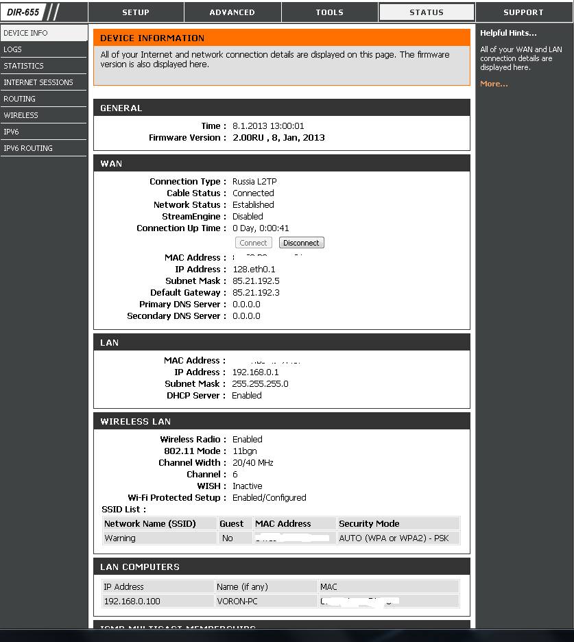 Пробовал с разными браузерами - opera, chrome, firefox, ie проблема везде одинакова - с воткнутым шнуром в ван порт и подключенным л2тп соединением при заходе на адрес 192.168.0.1 выдает только страничку статуса, при клике на любую другую ссылку в настройках выкидывает на страничку авторизации и далее опять на страничку статуса