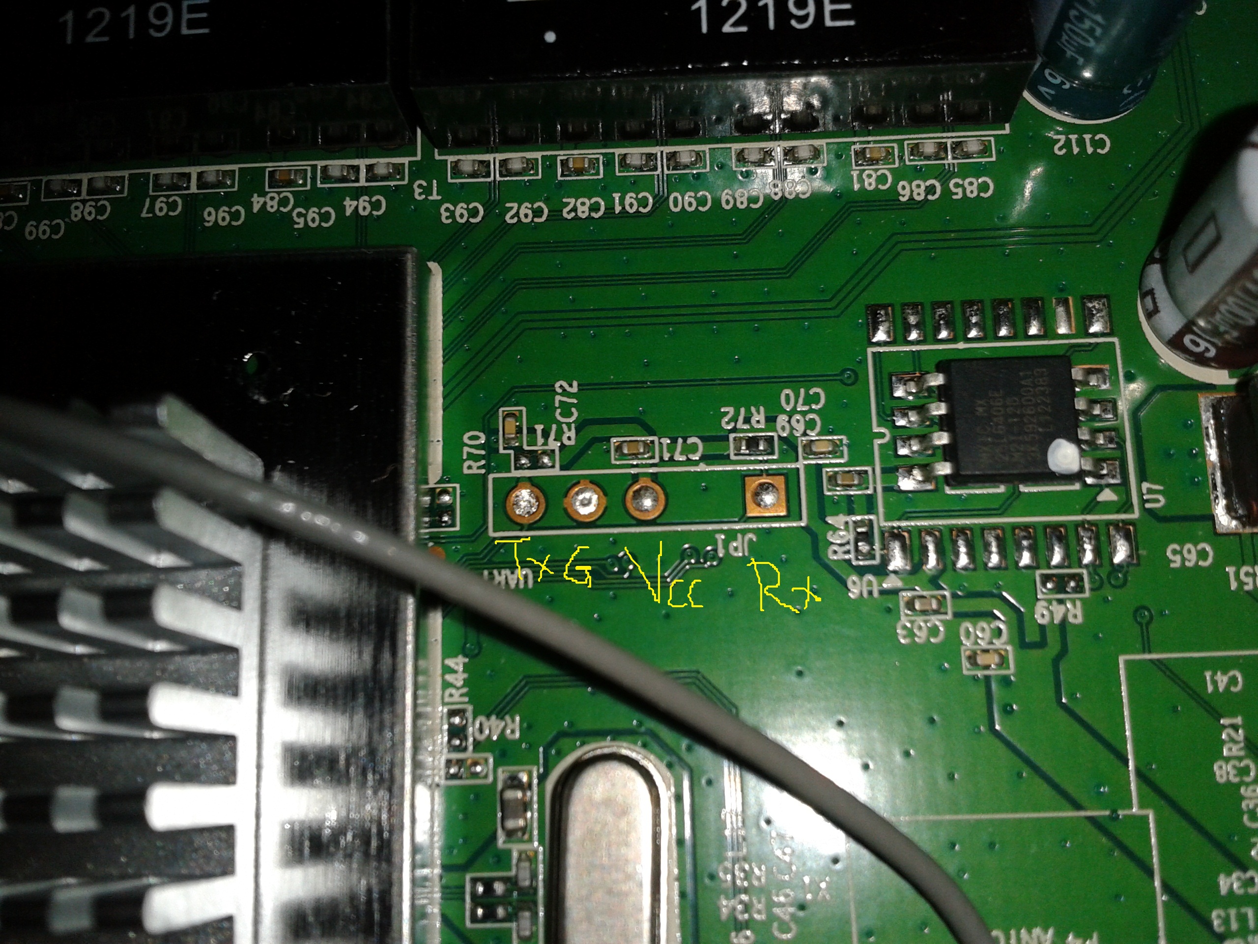 4. Подключил вот такой преобразователь USB->COM http://www.pololu.com/catalog/product/1300 (просто есть такой дома, можно и другой) и припаял к UART разъему, причем RX программатора к TX роутера, TX программатора к RX роутера. На моей фотке все верно.