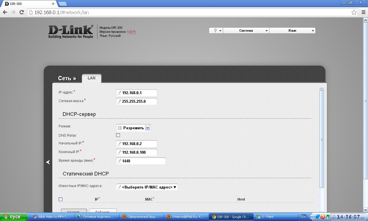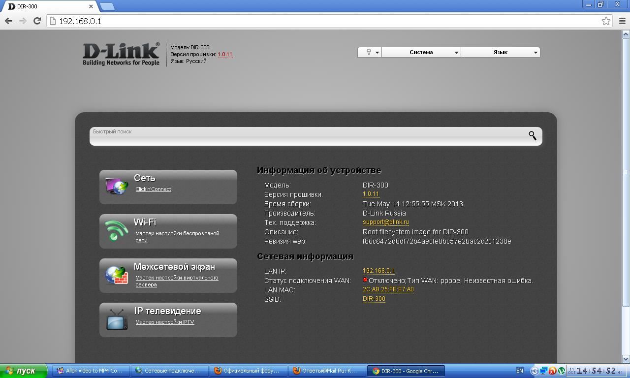 Помогите пожалуйста, купил роутер D-LINK DIR 300 и не могу сделать соединение пишет неизвестная ошибка, прошивку обновил до 2.09, читал все страницы и делал как написано но ничего не выходит на телефоне сетка есть но никуда не заходит. вот лог журнала Jan 1 00:00:06 syslogd started: BusyBox v1.19.2 Jan 1 00:00:06 kernel: |No chipID Sft chipSize blkSize secSize pageSize sdCk opCk chipName | Jan 1 00:00:06 kernel: | 0 c22016h 0h 400000h 10000h 1000h 100h 50 0 MX25L3206E| Jan 1 00:00:06 kernel: ---------------------------------------------------------------------------- Jan 1 00:00:06 kernel: SPI flash(MX25L3206E) was found at CS0, size 0x400000 Jan 1 00:00:06 kernel: flash_bank_1: squashfs filesystem found at offset 0x140000 Jan 1 00:00:06 kernel: Creating 7 MTD partitions on "flash_bank_1": Jan 1 00:00:06 kernel: 0x000000000000-0x000000010000 : "boot" Jan 1 00:00:06 kernel: 0x000000010000-0x000000020000 : "MAC" Jan 1 00:00:06 kernel: 0x000000020000-0x000000030000 : "config" Jan 1 00:00:06 kernel: 0x000000030000-0x000000170000 : "kernel" Jan 1 00:00:06 kernel: 0x000000140000-0x000000800000 : "rootfs" Jan 1 00:00:06 resident: start ipoe Jan 1 00:00:06 start_ip: begin (br0 -> br0) Jan 1 00:00:06 resident: start ipoe (v716779276) on br0 Jan 1 00:00:06 kernel: usbmon: debugfs is not available Jan 1 00:00:06 kernel: Initializing USB Mass Storage driver... Jan 1 00:00:06 kernel: usbcore: registered new interface driver usb-storage Jan 1 00:00:06 kernel: USB Mass Storage support registered. Jan 1 00:00:06 kernel: -------8196D OTG init Jan 1 00:00:06 kernel: reg e0=99 Jan 1 00:00:06 kernel: reg e1=ac Jan 1 00:00:06 kernel: reg e2=98 Jan 1 00:00:06 kernel: reg e3=c1 Jan 1 00:00:06 kernel: reg e4=1 Jan 1 00:00:06 kernel: reg e5=89 Jan 1 00:00:06 kernel: dwc_otg logicmodule: base=0xb8030000 Jan 1 00:00:06 kernel: dwc_otg logicmodule: otg_dev=0x81f71c80 Jan 1 00:00:06 kernel: ----init hcd----- Jan 1 00:00:06 kernel: [S3] hcd==81f70a00 Jan 1 00:00:06 kernel: DWC_otg: Using DMA mode Jan 1 00:00:06 kernel: dwc_otg logicmodule: DWC OTG Controller Jan 1 00:00:06 kernel: dwc_otg logicmodule: new USB bus registered, assigned bus number 1 Jan 1 00:00:06 kernel: dwc_otg logicmodule: irq 15, io mem 0xb8030000 Jan 1 00:00:06 kernel: set OTG host to high speed ! Jan 1 00:00:06 kernel: DWC_otg: Init: Port Power? op_state=1 Jan 1 00:00:06 kernel: DWC_otg: Init: Power Port (0) Jan 1 00:00:06 kernel: usb usb1: default language 0x0409 Jan 1 00:00:06 kernel: usb usb1: New USB device found, idVendor=1d6b, idProduct=0002 Jan 1 00:00:06 kernel: usb usb1: New USB device strings: Mfr=3, Product=2, SerialNumber=1 Jan 1 00:00:06 kernel: usb usb1: Product: DWC OTG Controller Jan 1 00:00:06 kernel: usb usb1: Manufacturer: Linux 2.6.30.9 dwc_otg_hcd Jan 1 00:00:06 kernel: usb usb1: SerialNumber: logicmodule Jan 1 00:00:06 kernel: usb usb1: uevent Jan 1 00:00:06 kernel: usb usb1: usb_probe_device Jan 1 00:00:06 kernel: usb usb1: configuration #1 chosen from 1 choice Jan 1 00:00:06 kernel: usb usb1: adding 1-0:1.0 (config #1, interface 0) Jan 1 00:00:06 kernel: usb 1-0:1.0: uevent Jan 1 00:00:06 kernel: hub 1-0:1.0: usb_probe_interface Jan 1 00:00:06 kernel: hub 1-0:1.0: usb_probe_interface - got id Jan 1 00:00:06 kernel: hub 1-0:1.0: USB hub found Jan 1 00:00:06 kernel: hub 1-0:1.0: 1 port detected Jan 1 00:00:06 kernel: hub 1-0:1.0: standalone hub Jan 1 00:00:06 kernel: hub 1-0:1.0: ganged power switching Jan 1 00:00:06 kernel: hub 1-0:1.0: global over-current protection Jan 1 00:00:06 kernel: hub 1-0:1.0: power on to power good time: 2ms Jan 1 00:00:06 kernel: hub 1-0:1.0: local power source is good Jan 1 00:00:06 kernel: hub 1-0:1.0: no over-current condition exists Jan 1 00:00:06 kernel: hub 1-0:1.0: enabling power on all ports Jan 1 00:00:06 kernel: ----enable irq----- Jan 1 00:00:06 kernel: [S1] dwc_otg_driver, lmdriver=80343980 Jan 1 00:00:06 kernel: Netfilter messages via NETLINK v0.30. Jan 1 00:00:06 kernel: nf_conntrack version 0.5.0 (512 buckets, 2048 max) Jan 1 00:00:06 kernel: ctnetlink v0.93: registering with nfnetlink. Jan 1 00:00:06 kernel: ip_tables: © 2000-2006 Netfilter Core Team Jan 1 00:00:06 kernel: arp_tables: © 2002 David S. Miller Jan 1 00:00:06 kernel: TCP cubic registered Jan 1 00:00:06 kernel: NET: Registered protocol family 17 Jan 1 00:00:06 kernel: Netlink[Kernel] create socket for igmp ok. Jan 1 00:00:06 kernel: Realtek FastPath:v1.03 Jan 1 00:00:06 kernel: nlmon: nlmon_init entry Jan 1 00:00:06 kernel: hub 1-0:1.0: state 7 ports 1 chg 0000 evt 0000 Jan 1 00:00:06 kernel: VFS: Mounted root (squashfs filesystem) readonly on device 31:4. Jan 1 00:00:06 kernel: Freeing unused kernel memory: 108k freed Jan 1 00:00:06 kernel: -------> Set MIB from /etc/Wireless/RTL8192CD.dat Jan 1 00:00:06 kernel: <------- Set MIB from /etc/Wireless/RTL8192CD.dat Success Jan 1 00:00:06 kernel: 88E 25M TEST 0x11=0x5b, 0x2c[0:3]=0x1 Jan 1 00:00:06 kernel: [PHY_ConfigBBWithParaFile][PHY_REG_PG_88E] Jan 1 00:00:06 kernel: Switch to channel 7 before doing 88E IQK Jan 1 00:00:07 update_ipfilters: error in params Jan 1 00:00:08 resident: init wan Jan 1 00:00:08 kernel: message received before monitor task is initialized kerSysSendtoNlMonTask Jan 1 00:00:08 kernel: Wan link is down Jan 1 00:00:08 resident: start pppd on eth1_2 Jan 1 00:00:08 resident: stop pppd on eth1_2 Jan 1 00:00:08 resident: set lock on eth1_2, with "/var/lock/eth1_2.lock" Jan 1 00:00:08 resident: stopped link(contype:ppp, iface:eth1_2) Jan 1 00:00:08 pppd[863]: RP-PPPoE plugin version 3.3 compiled against pppd 2.4.4 Jan 1 00:00:08 pppd[864]: pppd 2.4.4 started by admin, uid 0 Jan 1 00:00:09 kernel: Wan link is up! Jan 1 00:00:09 kernel: message received before monitor task is initialized kerSysSendtoNlMonTask Jan 1 00:00:11 kernel: cp0 , vid =9, portmask=fcp1 , vid =2