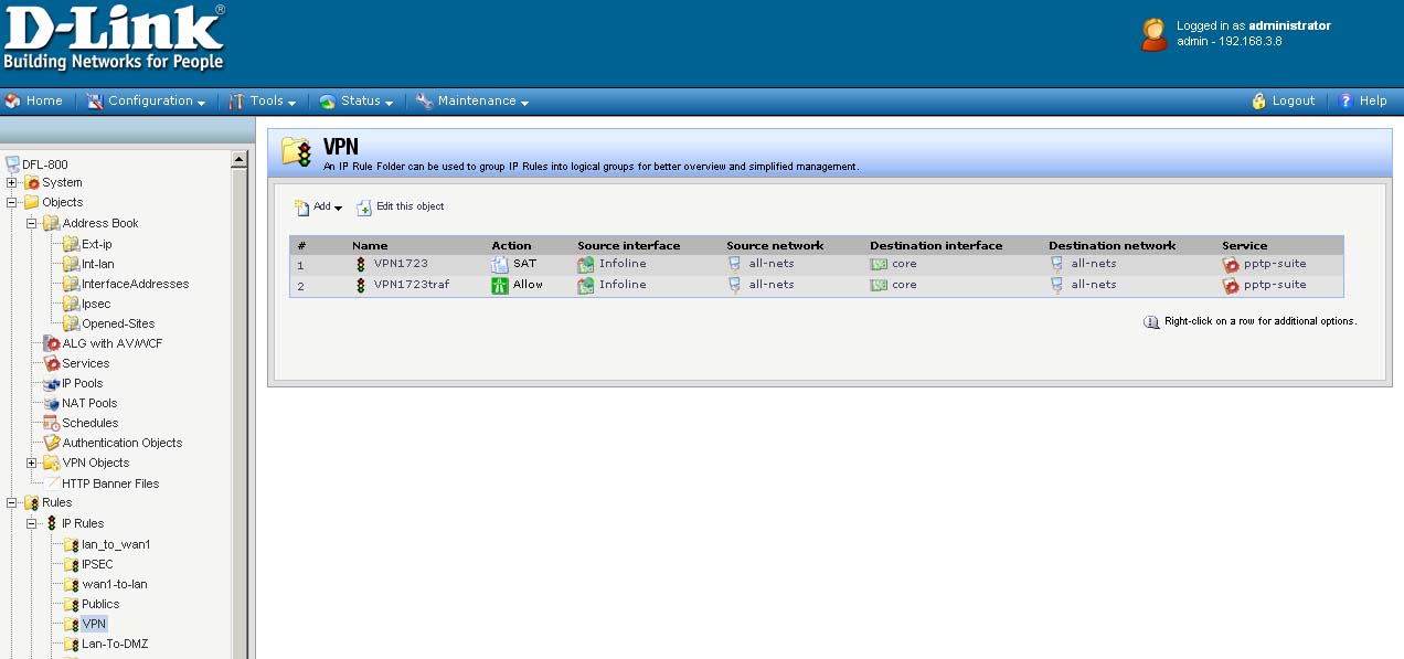 Проблема следующая: есть DFL-800. Прошивка 2.27.00.14. За ним стоит vpn-сервер на Win2003. До некоторого момента все работало как часы. На данный момент внешние пользователи не могут подключиться к впн-серверу. Происходит проверка имени пользователя и пароля, а затем отказ с ошибкой 721 (удаленный компьютер не отвечает). Из локальной сети подключение к впн-серверу происходит нормально. Через порт dmz так же нормально. Провайдер отвечает, что никакие порты не закрыты. (Подключены два провайдера, и ни через одного впн не работает). Такая же проблема возникла на свежекупленном DFL-860 (с третьим провайдером). Настройку правил прилагаю. Непонятно, в какую сторону теперь копать? Заранее благодарю за помощь.