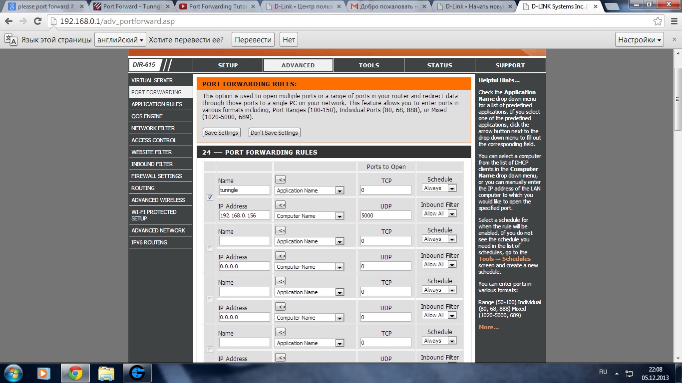 Доброго времени суток!Борюсь с этой проблемой уже очень долго,и до сих пор внятного и действенного решения получить не смог.Суть заключается в следующем:существует такая программа,которая называется "Tunngle".Она представляет из себя программу для создания удаленного лан-туннеля,то есть я и мой товарищ,находясь в разных частях света,можем находиться в LAN-сети(в теории) и это бы позволило поиграть,конечно же,в некоторые игрушки,в которых либо не предусмотрен сетевой мультиплеер,либо он собственно платный.Так вот,данная программа не позволяет поиграть мне абсолютно ни с кем,она просто выводит сообщения такого рода:"Please,port forward if you can".Ну,английский язык я знаю на уровне чтения технической документации,в общем полез в настройки роутера,портфорвардить ,так сказать.Все по инструкции выставил,вроде бы все правильно,но нет!Порт остается закрытым.И так не только в tunngle,но и в хамачи(пишет "туннель через ретранслятор").Я уже и не знаю,что делать.Ваш форум-моя последняя инстанция.Прилагаю скриншот настроек портфорварда. Заранее спасибо.