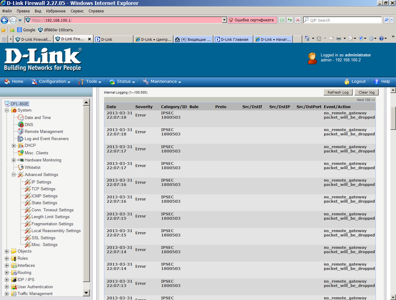 1. "Вы сначала должны создать несущую сеть" - делал по трем различным инструкциям (http://www.dlink.ru/ru/faq/85/575.html и http://d-link.ua/IPSec_DFL_DSR также пользовался официальной инструкцией от Dlink http://ftp.dlink.ru/pub/FireWall/DFL-860E/Description/ ) не получается соединить по ipsec.