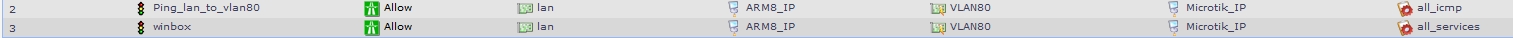 Сам микротик из Lan пингуется. Правила для доступа из сети Lan во Vlan сделаны. Пробовал в правилах указывать протоколы (создавал их на DFL) которые использует сам winbox (8291 и 20561), также ставил "all-service" и "all-tcpudpicmp" - результата никакого (см. скриншот).