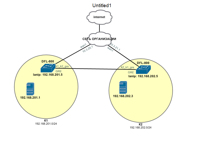 В К1 и К2 стоит по DFL-800. Между ними поднят GRE тоннель ибо шифровать трафик смысла нет, сидим внутри сети предприятия. "Чужие" адреса из каждого подразделения, естественно, пингуются. Все сервисы доступны.