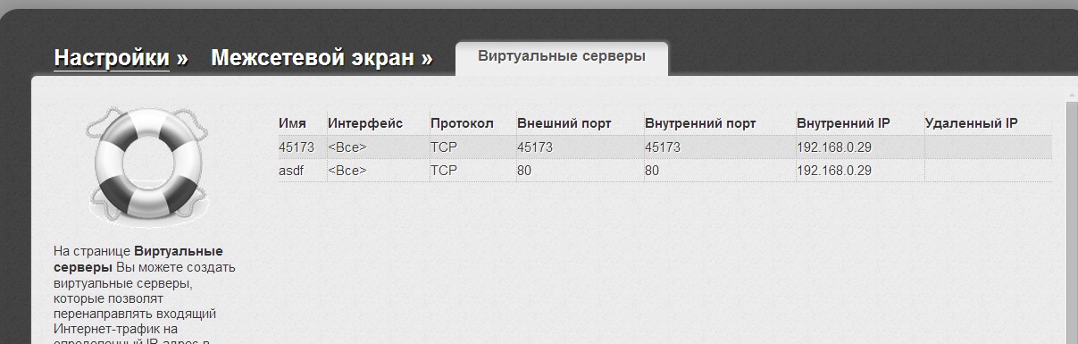 Изначально была прошивка 1.0.1, после обновления 2.0.17, поставил виртуальный сервер на порт 80, также включал DMZ, добавлял правило в firewall на порт 80 и на все порты, выключал firewall, добавил 192.168.0.1 как основной шлюз. IP адрес статический. Утилита http://ping.eu/ping/ находит по IP адресу при включенном DMZ, но порт 80 остается закрытым - проверял там же http://ping.eu/port-chk/ .