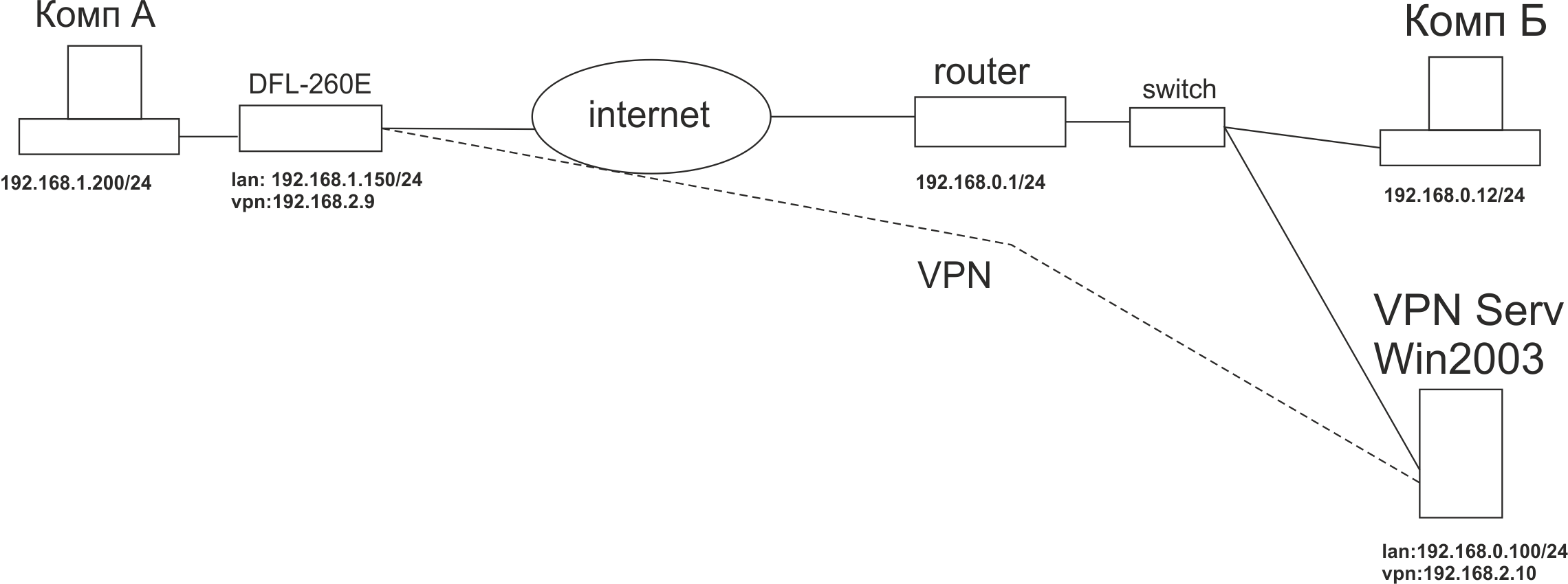 С компьютера Win2003 пингуются: IP lan интерфейса DFL (192.168.1.150), Комп А (192.168.1.200) и VPN интерфейс DFL-192.168.2.9