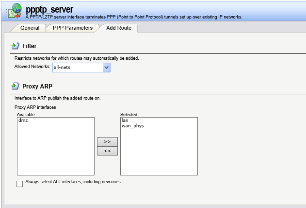 При такой настройке при поднятом соединении работает интернет, однако интернет-трафик идет в обход VPN-тоннеля. Доступ к ЛВС работает лишь частично - к диапазону адресов 192.168.0.1-192.168.0.254 (при том, что lannet задана как 192.168.0.0/16)