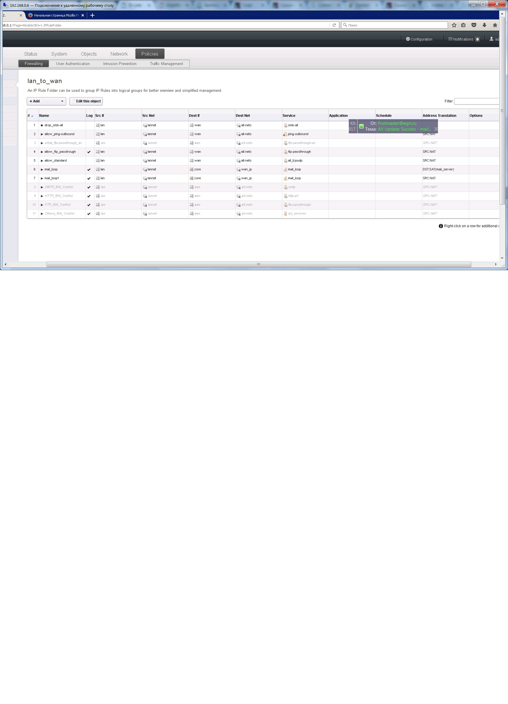 Есть аппарат на 100-мегабитном канале. В сети поднят ftp сервер. Прописаны nat ftp passtrough, sat и allow с ftp inbond до этого сервера. Заливаются данные на него на 100-ке, если отправлять данные с этого сервера наружу, используя клиент, то скорость та же сотка. При попытке же скачать с него что-то снаружи, скорость начинается на сотке, практически сразу падает до пары мегабит и потом рвется соединение. И так циклически. Для чистоты эксперимента, в сети поднимался другой сервер, на другой ОС и другом софте, эффект с ним тот же самый. Вопрос, куда копать? В другом месте стоит DFL860Е, отличий в настройках принципиальных не вижу, но тот же софт через него работает без каких-либо проблем в обе стороны.