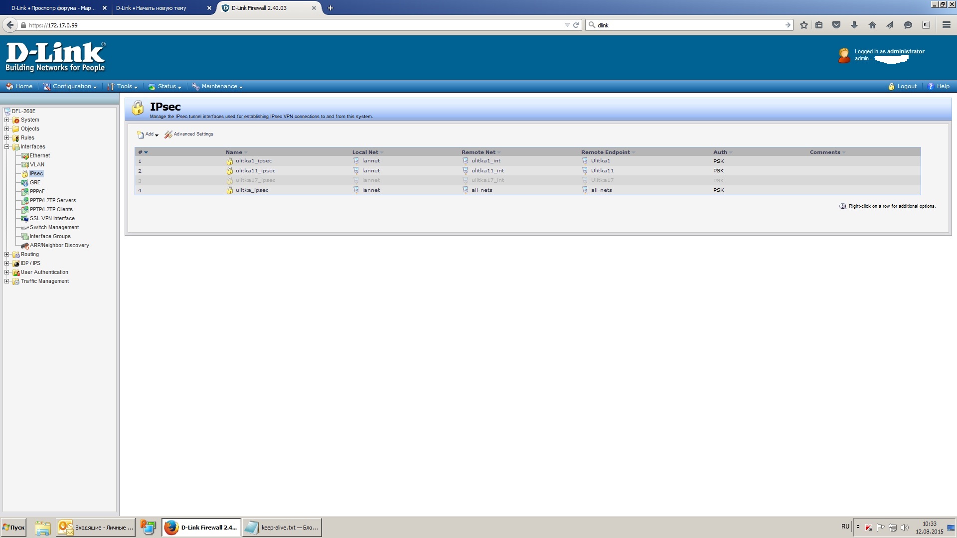 Заголовок сообщения: Несколько ipsec туннелей в DFl-260E