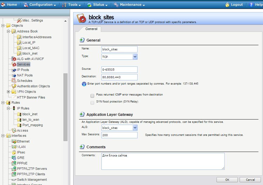 1. создал новый HTTP ALG и добавил в черный список сайт одноклассников