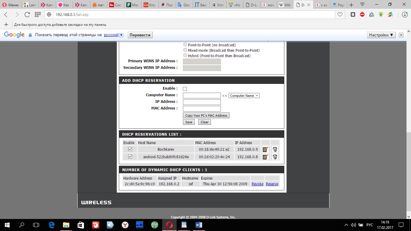 В списке то он присутствует - это верно. Просто в этом списке (NUMBER OF DYNAMIC DHCP CLIENTS) отображается, какие LAN устройства в данный момент арендовали IP адреса. А я хочу, чтобы компьютер или устройство всегда имело один и тот же назначенный мной IP адрес. Я так понимаю устройство должно отразится в списке DHCP RESERVATIONS LIST. А у меня при попытке его туда занести сообщение об ошибки МАС адреса.