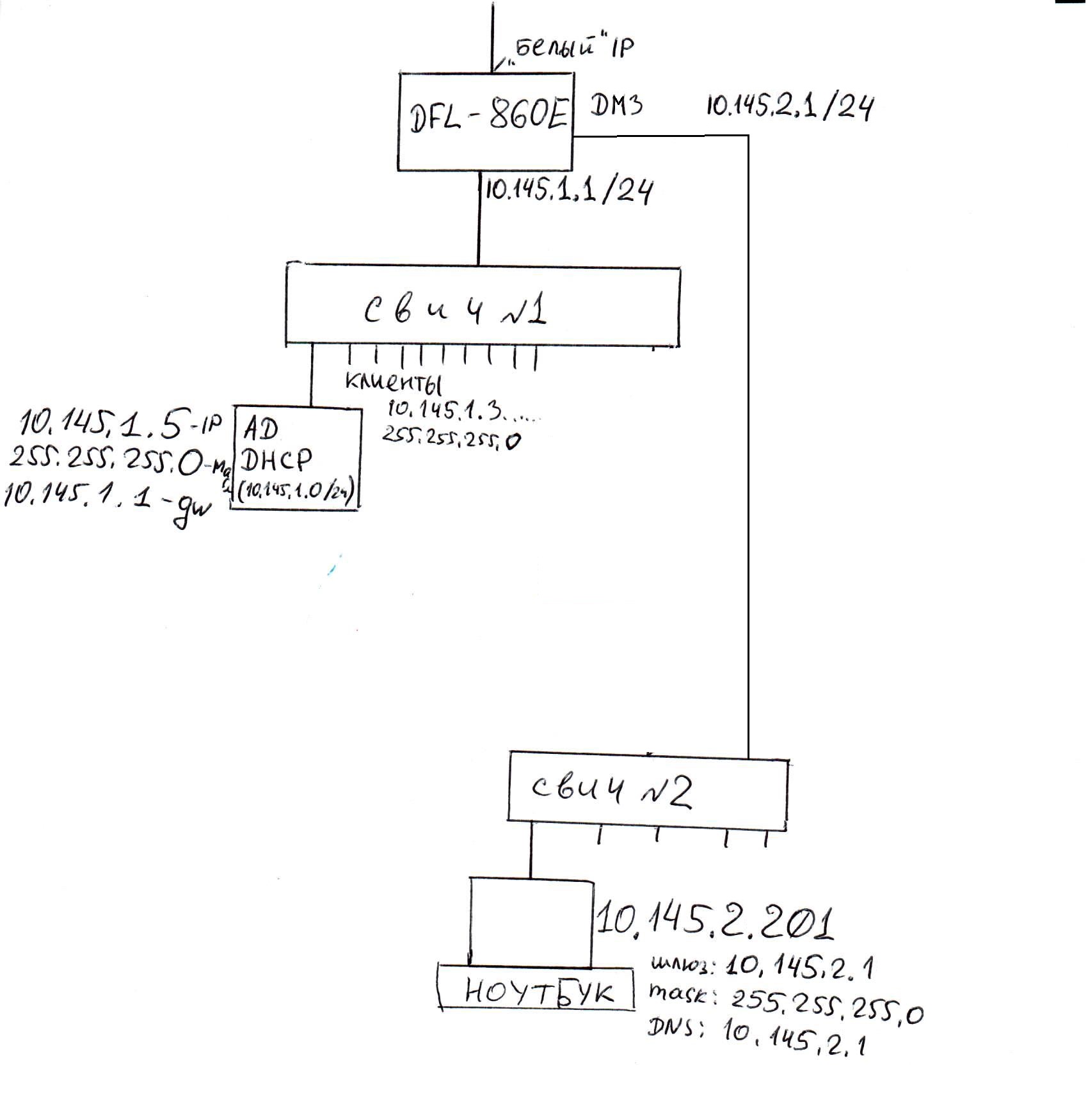 И эта схема реально утверждена Актом ))). Ip-адреса этим клиентам менять нельзя. Но они находятся в общем домене и пользуются всеми ресурсами сети 10.145.1.1/24 хотя и получают адреса не от общего DHCP-сервера, а от DFL-260E.