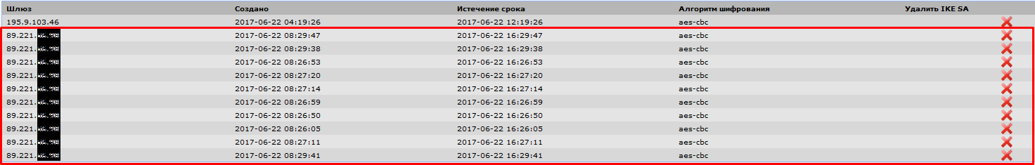 Проверяю отработку файловера. Выдергиваю кабель из wan1 в офисе A, устройства в офисах B, C, D стабильно устанавливают канал с wan2. Засовываю обратно кабель в wan1 в офисе A, канал поднимается только в одном офисе B, остальные начинают плодить каналы, как это видно на скриншоте.