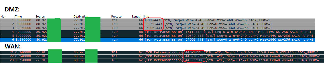 Вижу, что запрос поступает с моего адреса (80.92..) на адрес второго прова (77.91...) на порт DMZ, но ДФЛ отвечает от адреса (77.91...) на мой адрес (80.92...) с интерфейса первого прова wan (см. вложение2)