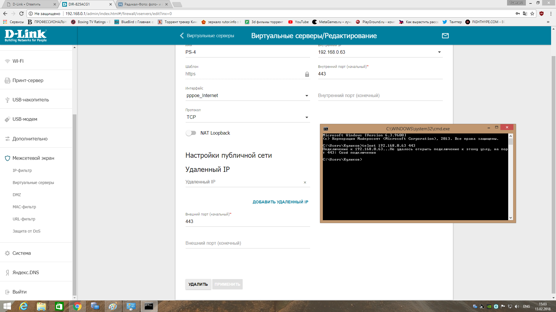 Подскажите пожалуйста, почему не пробрасываются порты на этом маршрутизаторе. Делаю все по инструкции, межсетевой экран, виртуальные серверы, добавить, в общих настройках прописываю имя, задаю шаблон, конкретно для порта 443, выбираю протокол tcp, в настройках внутренней сети указываю ip, на который хочу пробросить порт, в частности для PS-4, порт, жму применить, но порт не открывается. Проверяю на сайте портскан. При чем если я указываю другой порт, к примеру 9295, проблем нет. Порт открывается.