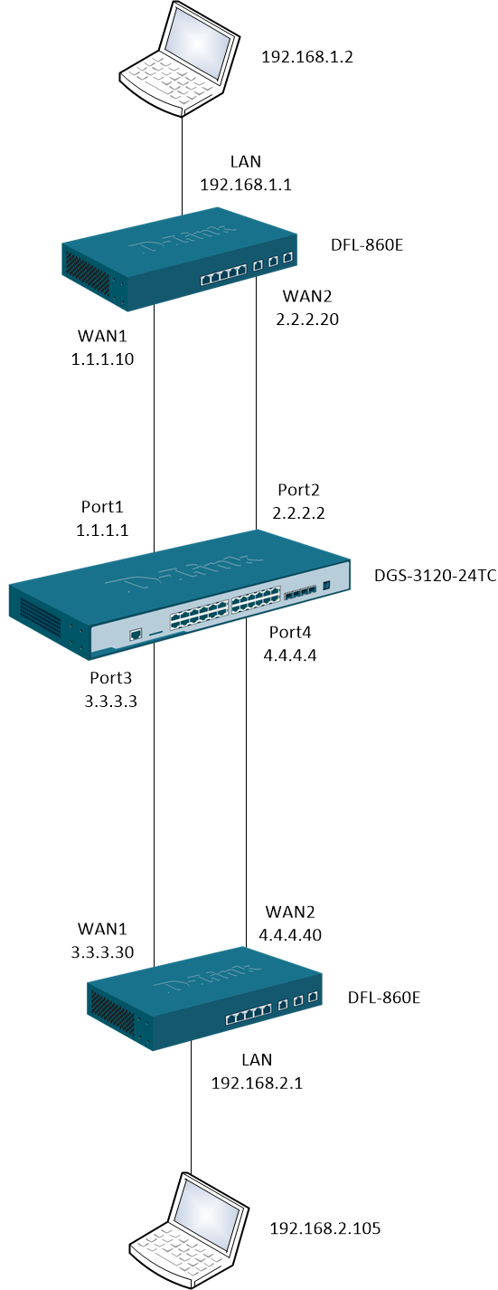 кроме двух dfl-860, в схеме участвовал L3 коммутатор - изображал интернет (для разделения среды между внешними интерфейсами, во избежании L3 петель)