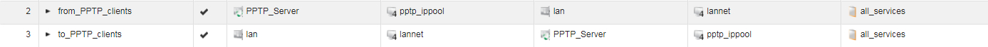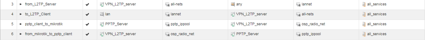 Вообще, должны быть еще 2 правила для хождения трафика между клиентами интерфейсов PPTP и L2TP