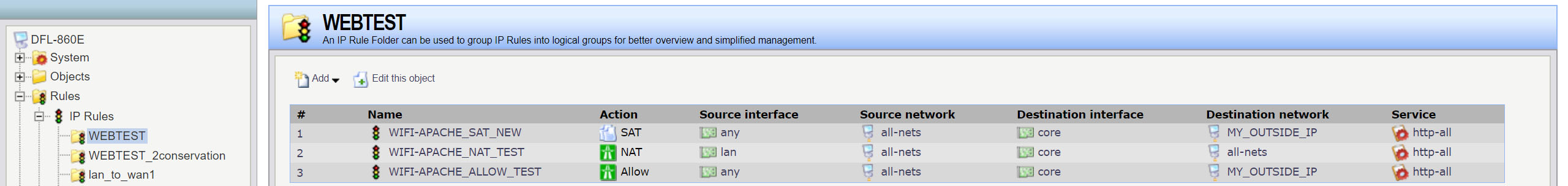 Задача сделать так, чтобы из интернета (и по возможности из локальной сети, по крайней мере на этапе тестирования) через внешний IP можно было получить доступ к сайту на сервере apache, который развернут на компьютере в локальной сети за DFL-860E. Бьюсь несколько дней, все перепробовал, ничего не получается! Помогите!