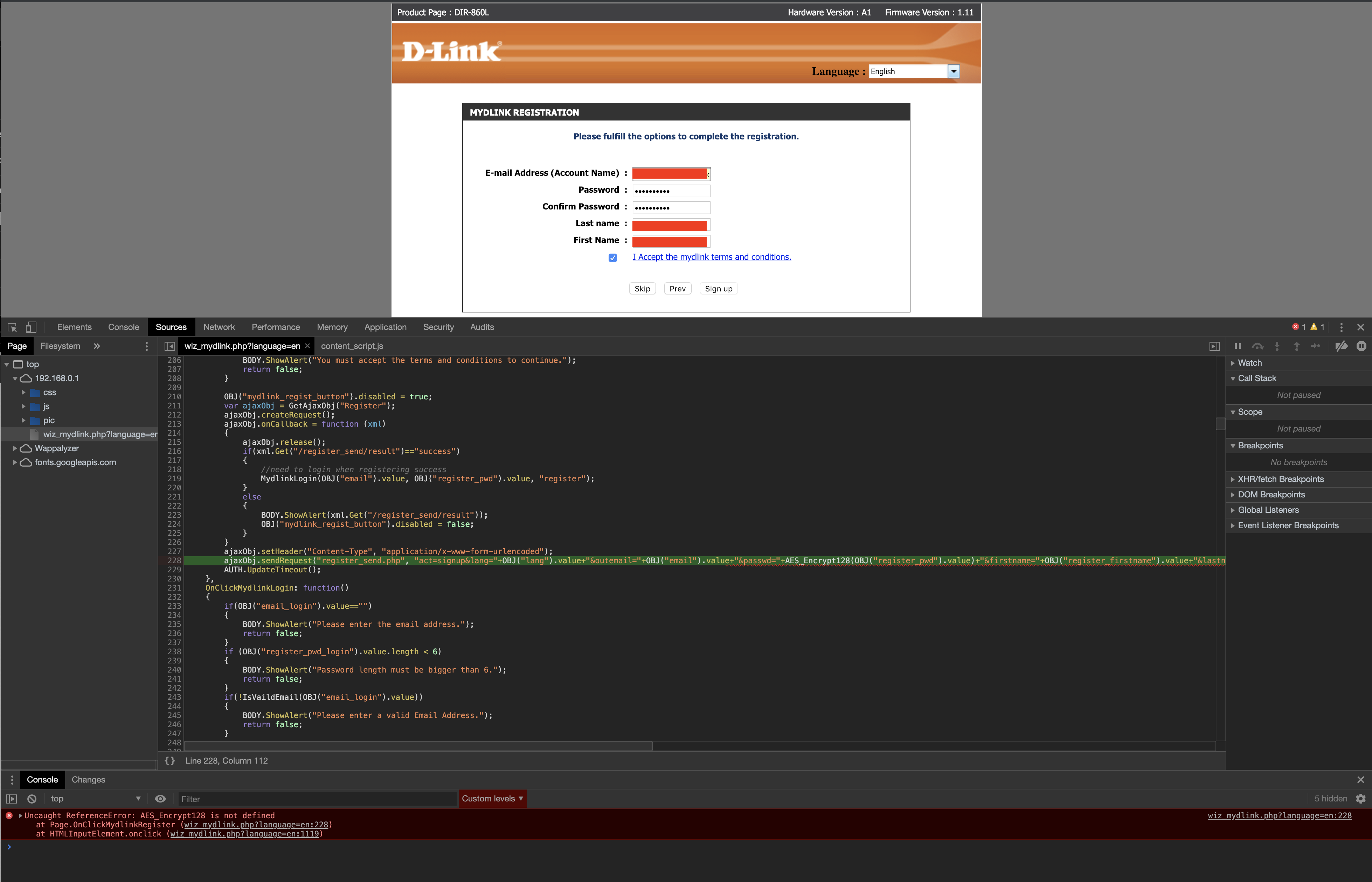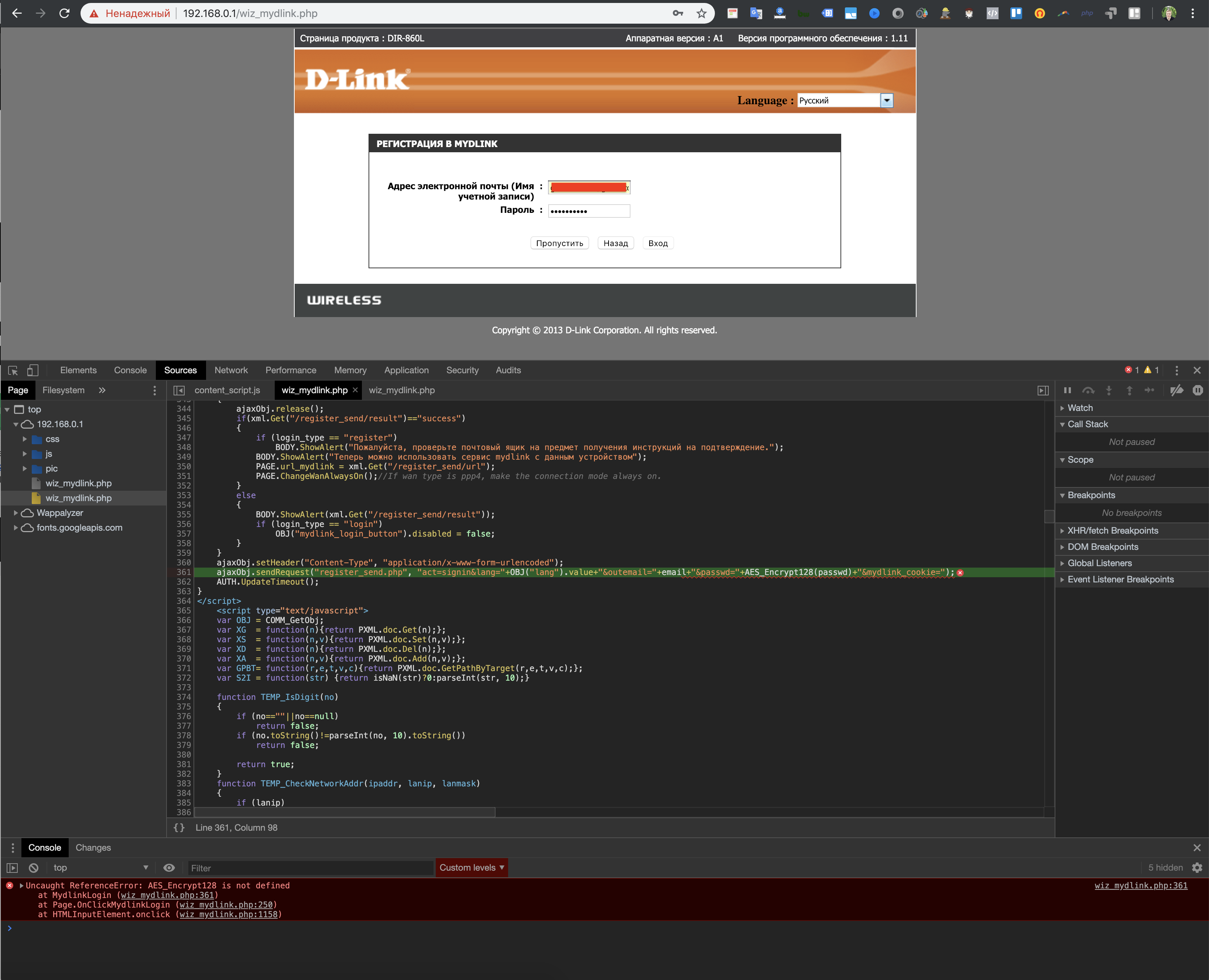после заполнения формы и нажатия кнопки login, ничего не происходит, страница не обновляется, ошибок нет. Ошибку обнаружил только в консоли браузера: в файле wiz_mydlink.php AES_Encrypt128 is not defined (on line 361)