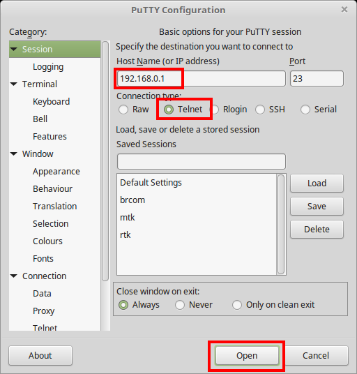 - Выбрать протокол - Telnet. Пропишите IP-адрес роутера, Port 23 и нажмите "Open" или "Соединиться".