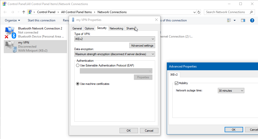 Помогите решить проблему, всю голову уже сломал. Есть шлюз DFL-870 с белым статическим IP (сначала пробовал прошивку 11.10.01.06, потом обновился на 12.00.13.05 - без разницы). На шлюзе настроен IPsec VPN IKEv2 для подключения клиентов. Пытаюсь установить подключение с использованием штатного VPN-клиента Windows 10 (1810) (находится за NAT, NAT-T включен). IKEv2 проходит первую фазу, а вторая отваливается с No proposal chosen (см. вложения). на клиента ошибка Policy Match Erorr. Не могу понять причину несовпадения параметров шифрования.