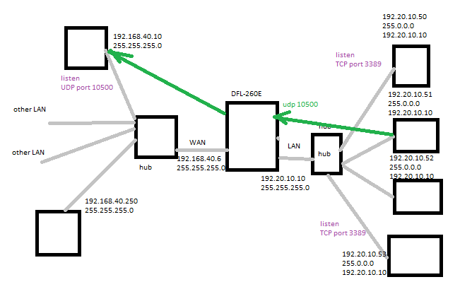 По средствам DFL-260E необходимо организовать пробросы портов как из вне, так и во внутренний сегмент. В частности: 1) Всем что в LAN - не доступно всё то что в WAN и абсолютно обратно, всем за WAN неизвестно, что в LAN за DFL. 2) Со стороны WAN на 192.168.40.6:tcp 8050 -> 192.20.10.50:tcp 3389 3) Со стороны WAN на 192.168.40.6:tcp 8053 -> 192.20.10.53:tcp 3389 4) Со стороны LAN на 192.20.10.10:udp 10500 -> 192.168.40.10:udp 10500 (всегда в одну сторону, ответы не нужны)