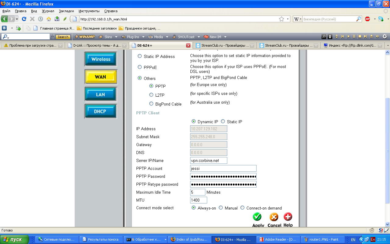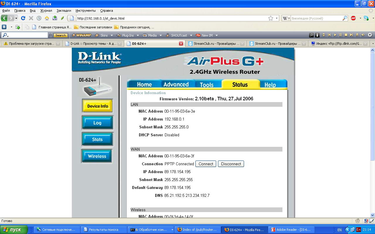 Друг попросил подключить дополнительный комп и ноут к домашней корбине. Я у знакомых купил неиспользуемый ими сабж DLink DI-624+. Однако, при попытке настроить под Корбину произошли удивительные вещи, которые прилагаются на скриншотах.