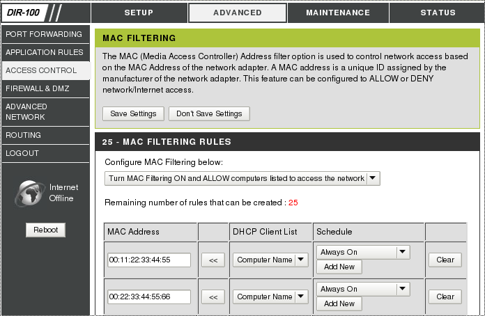 DizM, в твоем случае - это в каком? какой у тебя роутер/прошивка? Дело в том, что у меня в разделе MAC FILTERING RULES в настройках есть пункт TURN MAC FILTERING ON AND DENY COMPUTERS LISTED TO ACCESS THE NETWORK, но он не работает - даже если я прописываю там mac-адреса нужных компьтеров, они все-равно имеют выход в нет. :( что я не так делаю? кто-нибудь с этим стыкался?