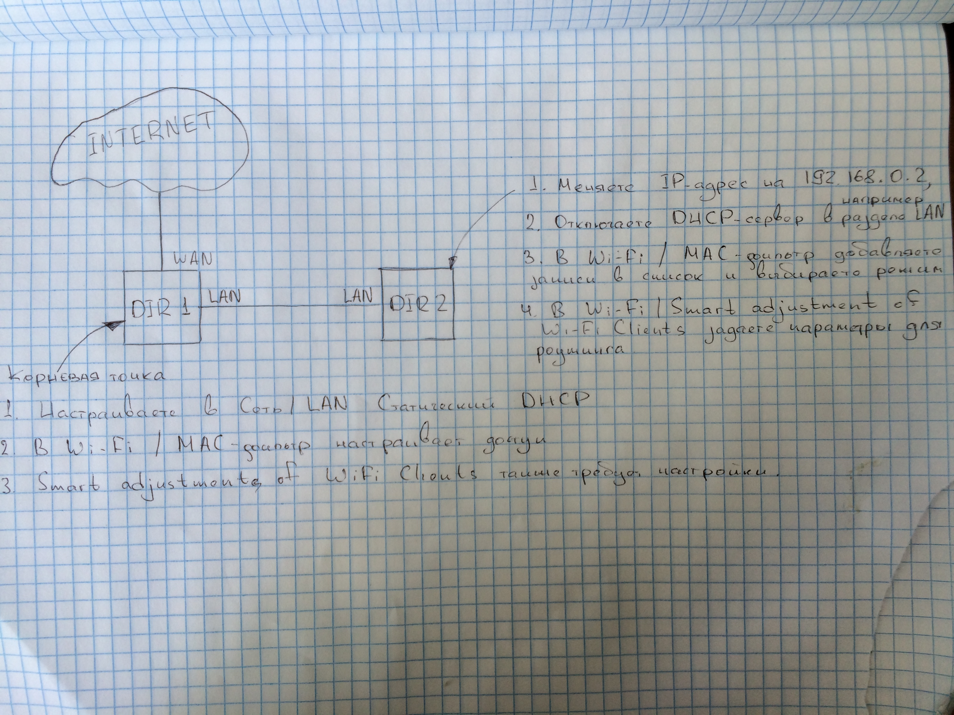 так... что-то я маленько начал запутываться. Я понимаю, что привязка mac к определенному ip и mac-filter это разные функции. Мне нужно и то, и другое. Вы предлагаете привязывать (DHCP reservation) и фильтровать (mac-filter) всех потребителей только на первом (основном) роутере, а для wifi-клиентов включать mac-filter на дочернем. В случае проводного подключения клиента к дочернему роутеру, он будет выполнять правило привязки и фильтрации, настроенное на первом? Сам думаю, что нет, у него же ip pool другой, мы же его сами меняем на отличный от основного.. Дальше ещё встанет вопрос о принтере (Samsung M2070W), подключённом по wifi к дочернему роутеру: будут ли клиенты, подключённые к основному роутеру видеть данный принтер?
