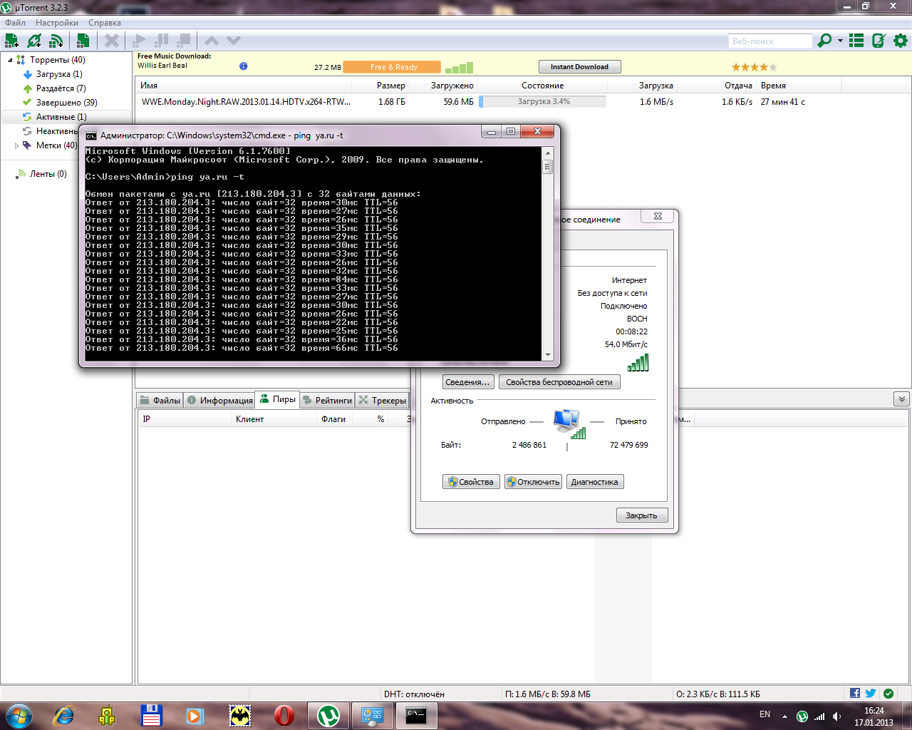 Причем даже в 802.11g на 54мбит если и коннектится, запускаешь торрент (он даже и не раздает/качает ничего, а просто работает DHT) и все, инетом пользоваться невозможно.