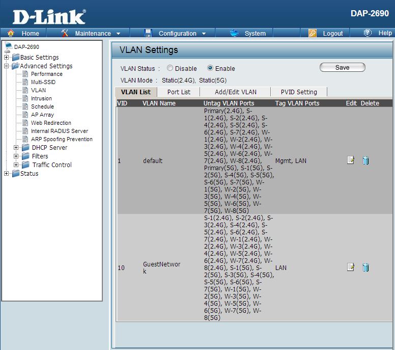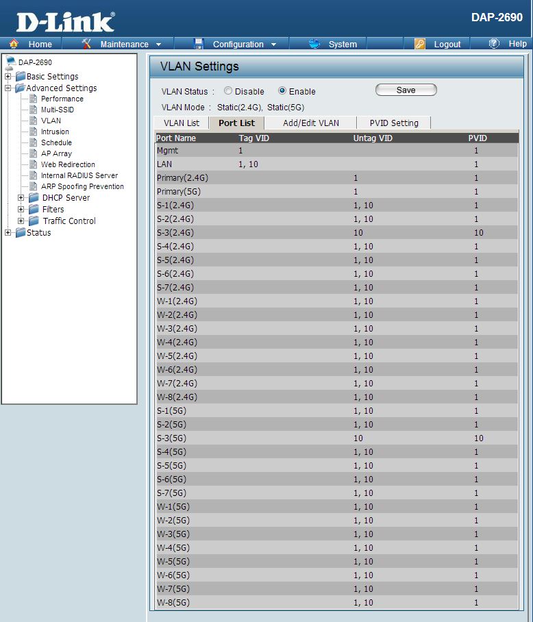 Изменил настройки VLAN: vlan 1: untagged: Mgmt, Primary(2.4G), S-1(2.4G), S-2(2.4G), S-4(2.4G), S-5(2.4G), S-6(2.4G), S-7(2.4G), W-1(2.4G), W-2(2.4G), W-3(2.4G), W-4(2.4G), W-5(2.4G), W-6(2.4G), W-7(2.4G), W-8(2.4G), Primary(5G), S-1(5G), S-2(5G), S-4(5G), S-5(5G), S-6(5G), S-7(5G), W-1(5G), W-2(5G), W-3(5G), W-4(5G), W-5(5G), W-6(5G), W-7(5G), W-8(5G) tagged: LAN vlan 10: untagged: S-3(2.4G), S-3(5G) tagged: LAN После этого Ap array работает (точки подключены к портам одного коммутатора, на которых vlan 1 и vlan 10 tagged)