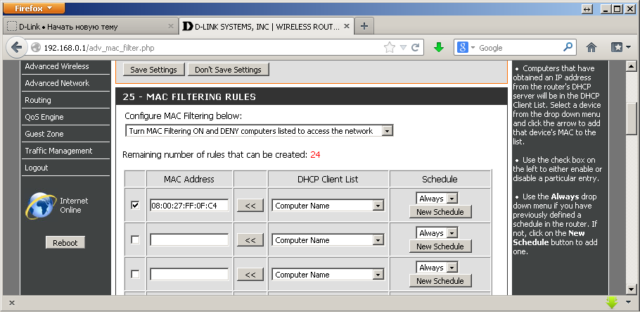 На маршрутизаторе D-Link DIR 320 не работает блокировка по MAC. В настройках Advanced -> Access Control выбрал режим "Turn MAC filtering on and deny ...." В списке указал MAC и поставил галку.