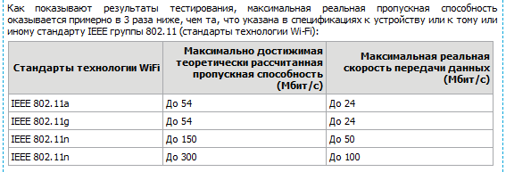 цитата: "...Канальные скорости не имеют ничего общего с пропускной способностью через беспроводную сеть. Кроме самих данных передается много служебной информации, она занимает примерно половину от представленной выше скорости..."