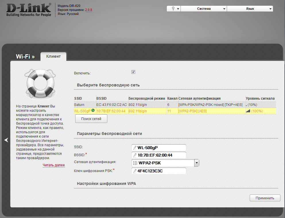 Никак не могу заставить DIR-620 /D/F1A с прошивкой 2.0.8 заставить работать как Wi-Fi клиент.