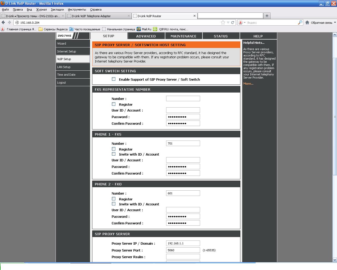 настройки DVG-7111s данный модем подключен к телефонной линии